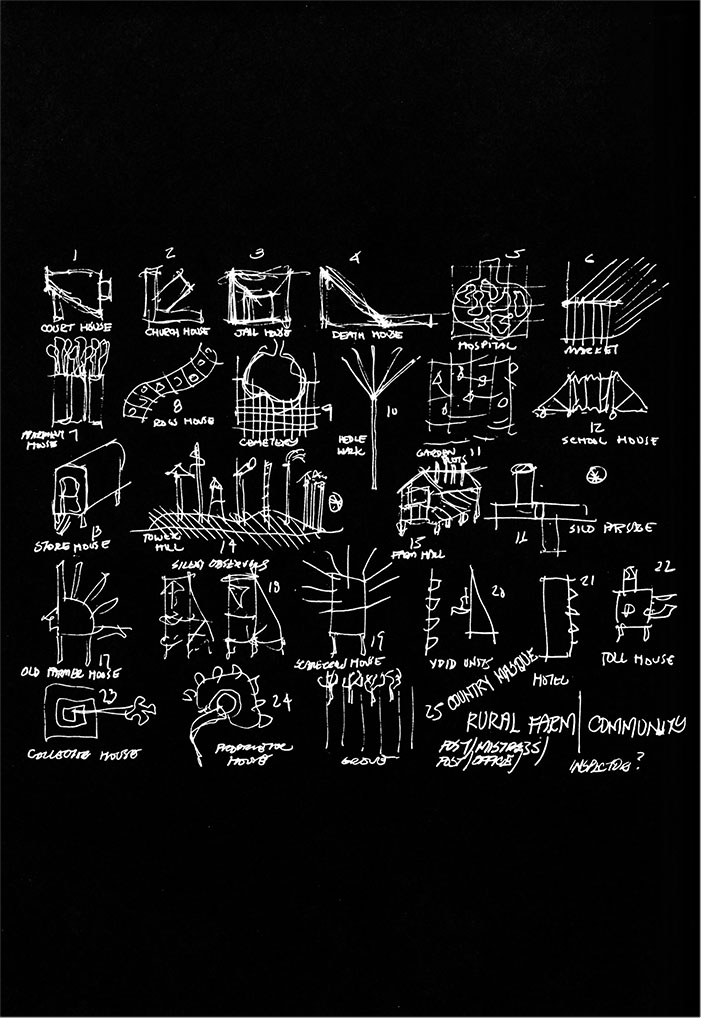 More importantly — and in contrast to the dominant reception of his work by his disciples or its consumption as an institutionalized ethic — Hejduk's obsession with renaming, staging encounters, and establishing instructions suggests that he is engaged in a practice of architectural nominalism, one where "the idea of an inscription replaces the idea of fabrication."14 More significant than the official institutional rhetoric of crafting the detail, then, is the act of signing the detail as a readymade, revealing its potential to vibrate through larger institutional and disciplinary mechanisms. If the detail is the understudy to urbanism in Hejduk's work, it is as it approaches the condition of the borderline. In distinction to both Aldo Rossi's analogous city and Rowe's collage city, ventures a city of the anomalous.15 One result of this investigation of the borderline is an urbanism that oscillates between the conditions of synecdoche and spectacle.16 By focusing on discrete elements and details (e.g., awnings, balconies, water towers, smokestacks, stairs and landings, exhaust ducts, satellite dishes, etc.) Hejduk exposes the fragmented unit of architectural activity (the anonymous, machine-made, or "off-theshelf"), where the part stands in for the whole. Equally, however, Hejduk revisits an auratic vision of production, one which emphasizes gesture, passion, and the expressive symbolism of the hand, resulting in an organic totality, an ultimately bounded and composed whole. The question arises, then, whether Hejduk's concern with accumulation and number comprehends multiplicity and contagion, or merely sustains familial and contracted relations, whether or not it is contained by a humanist aesthetic and liberal-legal vision of individual to collective (and part to whole) articulations. These, of course, are political matters as well as aesthetic, and it is precisely in pursuing an explicitly political line of inquiry that Hejduk's speculations display a lineage similar to that of Rowe.17 In distinguishing his early work from his "first city plan"-the Cemetery for the Ashes of Thought (1975) — Hejduk comments that the "first real shift in the work was political." As will be seen later, however, this political dimension was already present in his early study with Colin Rowe on the town of Lockhart, Texas, from 1957.